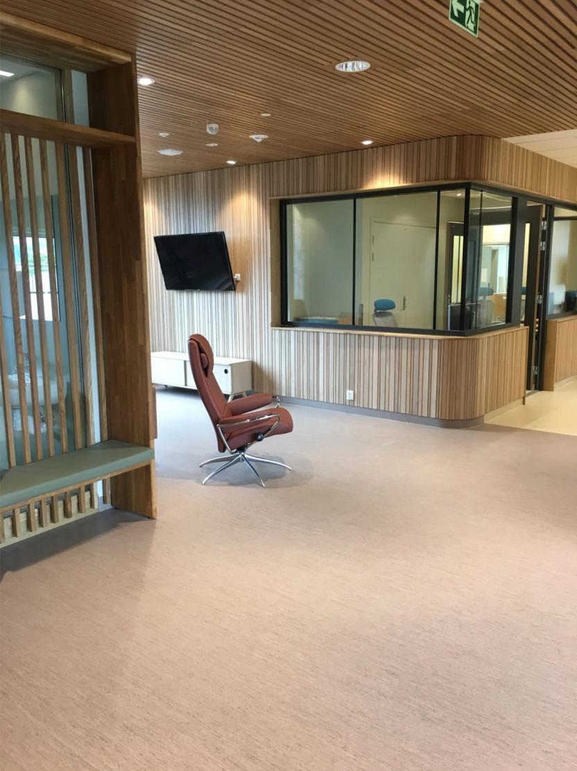 Arbeidsplasser for personell i avlåst arbeidsstasjon, med utsyn til korridor og pasientenes fellesarealer.