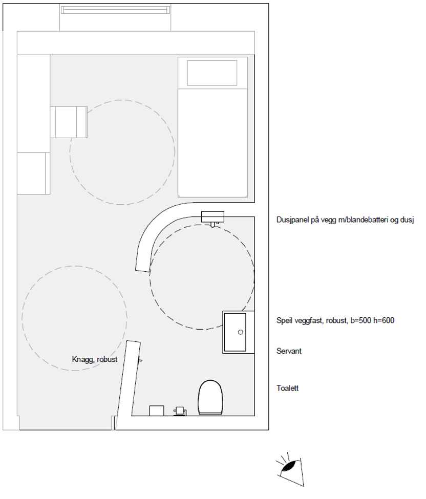 - Plassering av bad (mellom sengerom, forranliggende mot korridor eller mot fasade) vil få konsekvenser for utforming, siktlinjer og for tilkomst for teknisk personell.