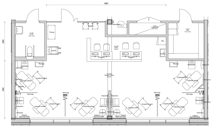 Kombinasjon mellom åpen sal med flere plasser og enerom for pasienter som har behov for skjerming.