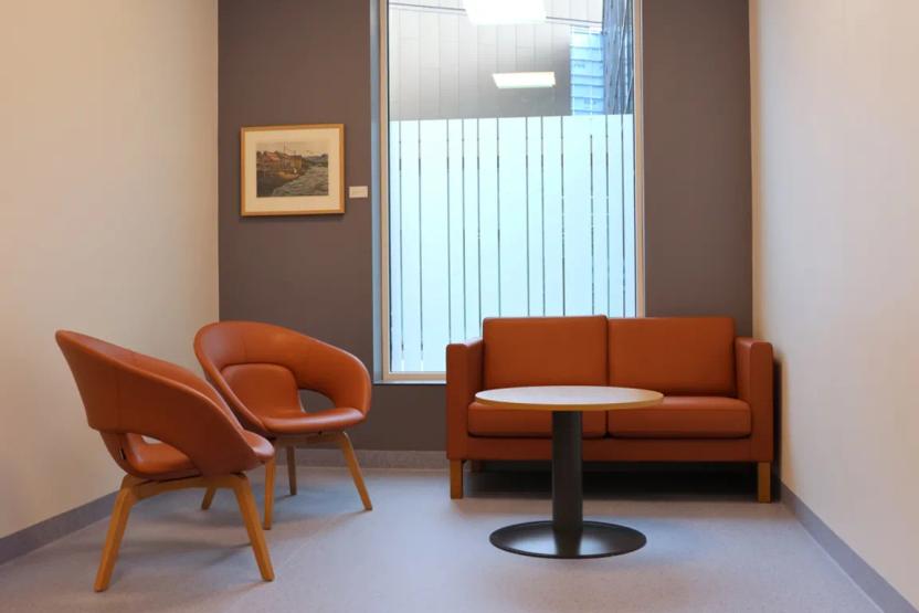 Rom til/for samtaleterapi og andre type samtaler mellom behandler og pasient, og evt. pårørende, tolk eller annen behandler. Kan også benyttes til annen type pasientaktivitet.