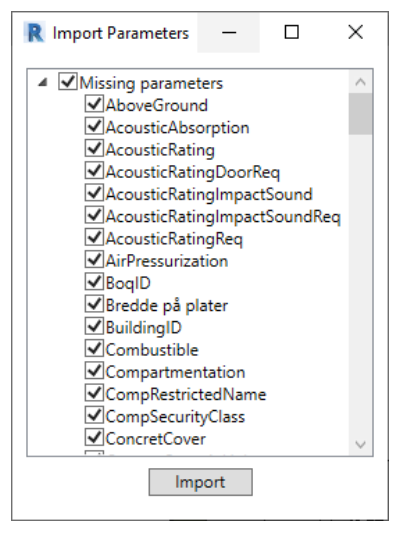 3. Egenskapene fra prosjektets kravdatabase listes opp. Listen indikerer hvilke egenskaper som mangler i prosjektet (Missing parameters) og hvilke egenskaper som allerede eksisterer (Existing parameters) og som kan sløyfes (ingen duplikater av egenskaper).