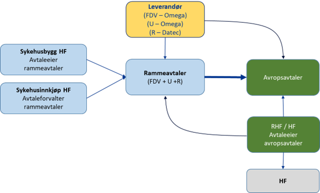 De nasjonale rammeavtalene er inngått av Sykehusbygg HF. De fire regionene og Sykehusbygg HF kan gjøre avrop på disse. Dette skal skje gjennom egne avropsavtaler, og innenfor det den enkelte rammeavtalen tillater. Avropsavtalene skal inngås direkte mellom leverandør og den enkelte av de nevnte avroperne.
