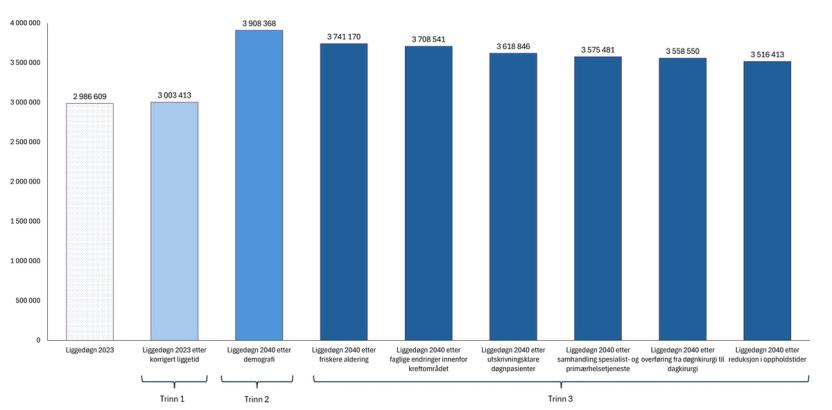 Figuren nedenfor presenterer en trinnvis framskriving av antall liggedøgn for utvalgte helseforetak samlet i Norge år 2023 til år 2040 ved bruk av den nasjonale framskrivingsmodellen for somatikk. Inndelingen fra trinn 1 til 3 i modellen presenteres også.