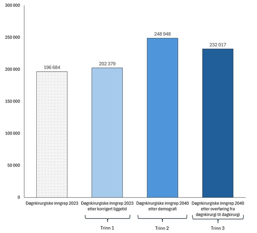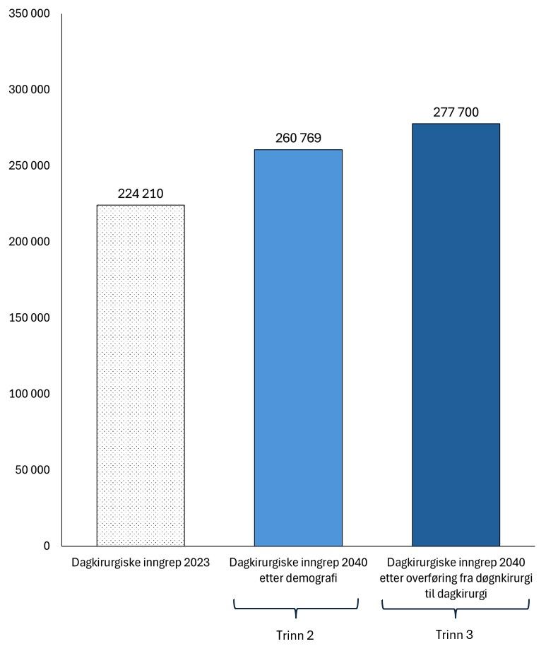 Figuren nedenfor presenterer en trinnvis framskriving av antall dagkirurgiske inngrep for utvalgte helseforetak samlet i Norge år 2023 til år 2040 ved bruk av den nasjonale framskrivingsmodellen for somatikk. Inndelingen fra trinn 2 til 3 i modellen presenteres også.