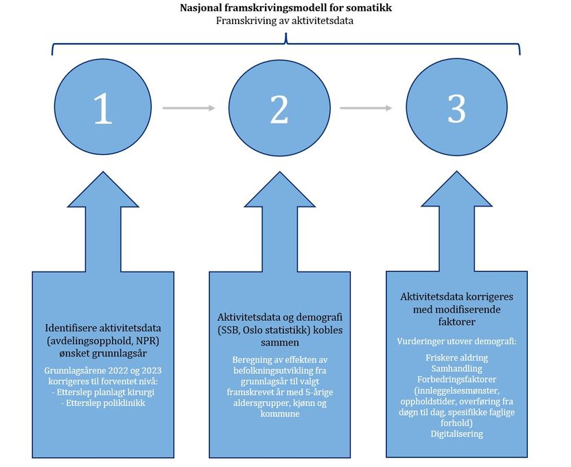 Framskriving av aktivitet for somatisk sektor foregår gjennom den nasjonale framskrivingsmodellen. Modellen framskriver aktiviteten gjennom tre trinn for alle behandlingsnivåer (liggedøgn, døgnopphold, medisinske dagopphold, polikliniske konsultasjoner, samt døgnkirurgiske og dagkirurgiske inngrep), som vist i figuren nedenfor.
