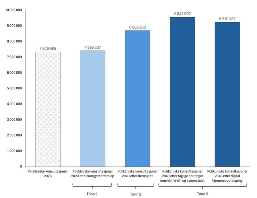 Figuren nedenfor presenterer en trinnvis framskriving av antall polikliniske konsultasjoner for utvalgte helseforetak samlet i Norge år 2023 til år 2040 ved bruk av den nasjonale framskrivingsmodellen for somatikk. Inndelingen fra trinn 1 til 3 i modellen presenteres også.