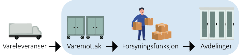 Driftsmodeller, løsningskonsepter med forsyningsteknologier beskriver vareflyt og varehåndtering i forsyningsfunksjonene, interne transportløsninger samt håndtering og lagring av ulike type varer på avdelingsnivå. Dette beskrives nærmere i kunnskapsgrunnlaget Varelogistikk. Denne gir mer detaljert beskrivelser av temaene forsyningsstruktur og forsyningsteknologier, samt beskrivelser av forsyningsfunksjonene, eksempelvis sentrallager, sterilsentral, sengevasksentral.1 I figuren under vises en skisse av vareleveranser fra varemottak til avdeling.